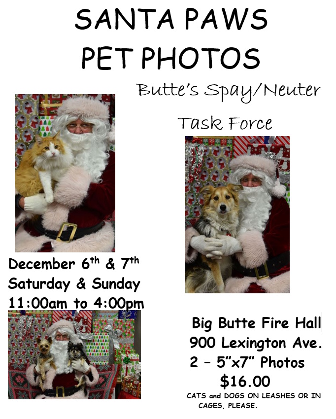 SANTA PAWS PET PHOTOS: Saturday & Sunday December 6th & 7th, 2025, 11:00am to 4:00pm, Big Butte Fire Hall, 900 Lexington Ave. Two 5”x7” Photos $16.00. CATS and DOGS ON LEASHES OR IN CAGES, PLEASE.